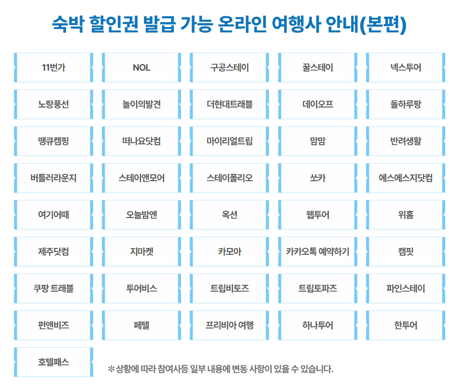 | 참여 온라인 여행사 | 공식 누리집 및 참여 여행사 통해 신청 | 할인권 발급 및 예약 가능 |
