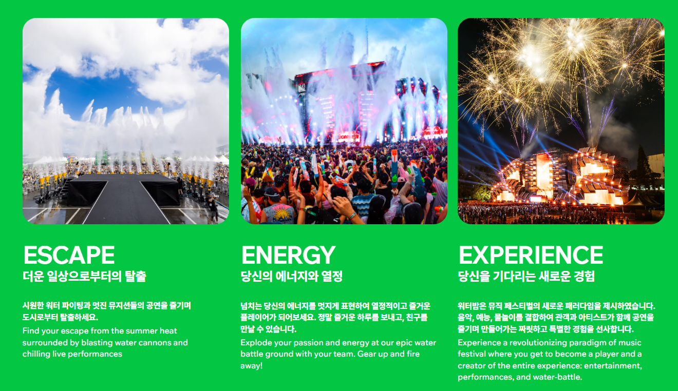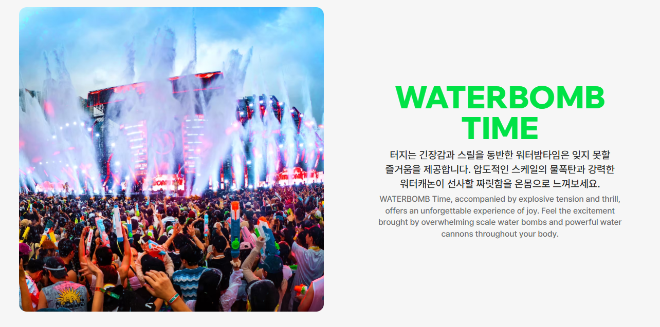 2025년 여름, 당신의 인생 페스티벌이 기다리고 있습니다. 무더위를 날려버릴 물총, 소름 돋는 라이브 무대, 잊지 못할 추억을 만들 수 있는 워터밤은 그저 ‘축제’가 아닙니다. 아직 늦지 않았어요. 지금 티켓 예매하고, 완벽하게 준비해보세요!